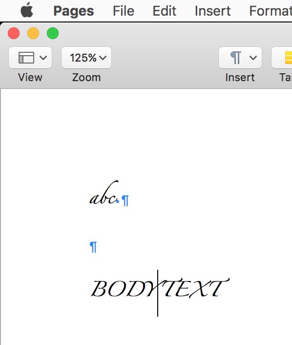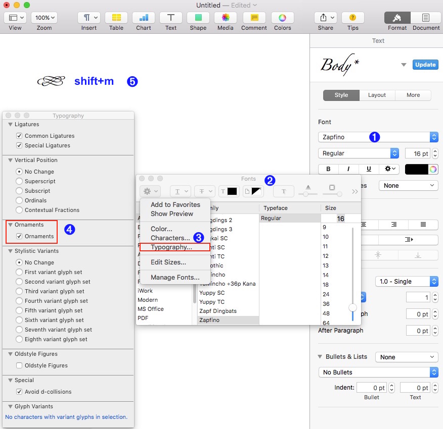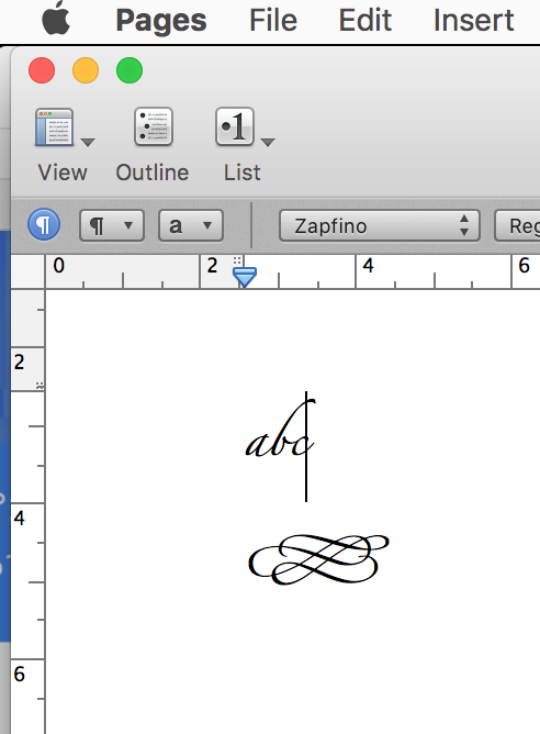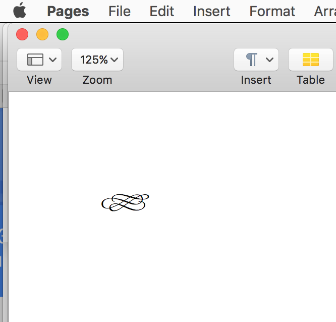 I can't find any recent threads on how to do this. I'd like to insert a character from Zapfino into a Pages document. I've read you can't copy characters out of Font Book, and my experience bears that out. According to some online information, I read PopChar would make this easy. It didn't. I can't find the glyph using sierra's or Pages character tools. According to Font Book, the glyph iD is 1,367.