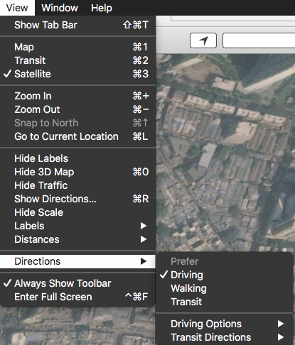 Using Apple Maps, and asking for directions, the list appears correctly on the left, but the route is not displayed when in Satellite mode, only in Map mode. The start and end point are show.