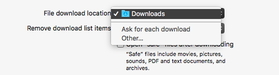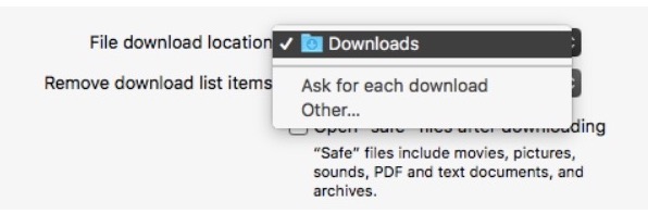 • In safari preferences > General make sure the settings in file download location as downloads .