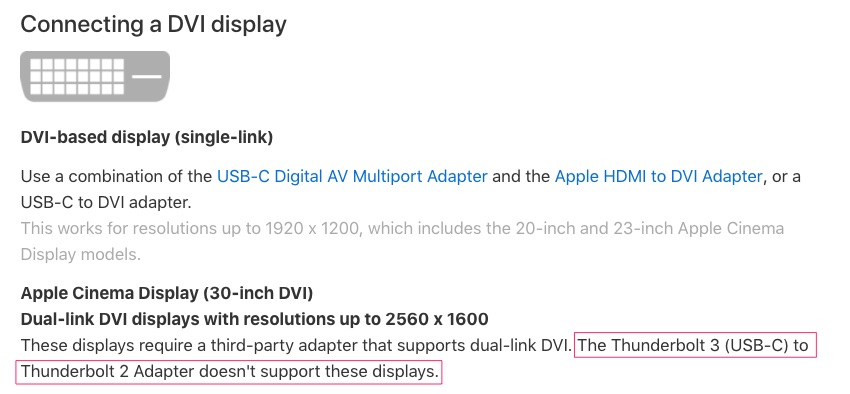 So in addition to the Apple thunderbolt 3 to 2 adapter not working, I can add one more adapter (repeat from my post above) that does not work (yet, still firmware-fantasizing) to dual link DVI monitors. = AllSmartLifeusb c to mini displayport.