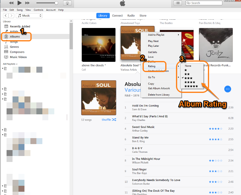 Here's an album where I have previously rated some, but not all songs. The ringed "rating" in the shot (3.) is the album rating, not the songs.