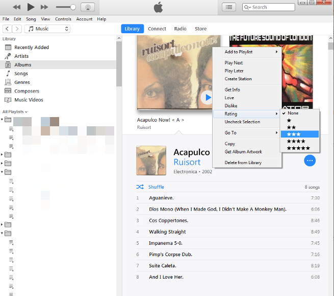 A common reason why users don't like the automatic ratings is that it causes songs to be put into the Favourite Songs Smart Playlist . If I leave those greyed out three-star ratings on the album Acapulco Now, they will be in my three-star-rated-songs Playlist, even though I don't like them.