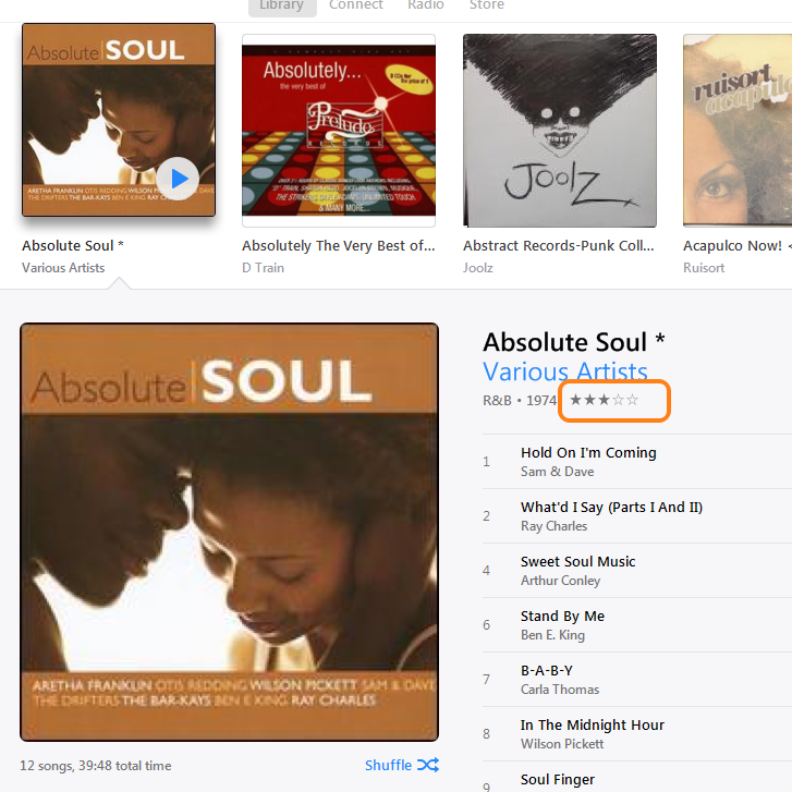 Still in the Albums view, notice that the Album Rating is in blue (compare it with the other album...) but the song ratings are in grey (because iTunes assigned these):