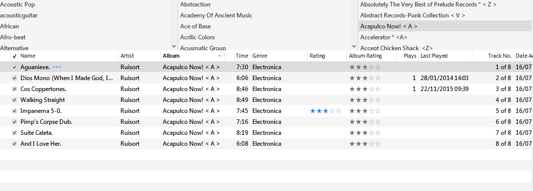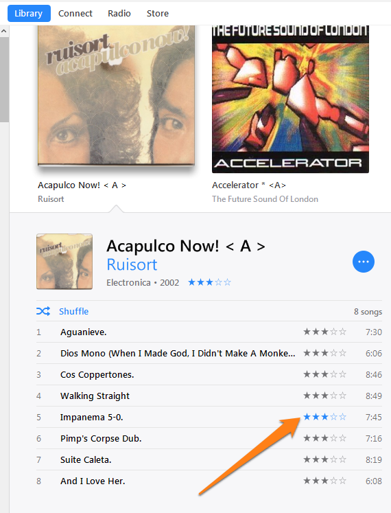 Back to the album Acapulco Now. If I subsequently assign a rating to one song on this album, that song rating turns blue, while the others stay in grey: