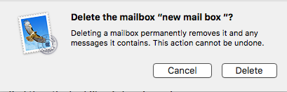 However, this morning I was deleting some of these mail folders as I no longer needed them, but one of them won't delete when I right click on it and select the Delete Mailbox... option. After I click the confirm button it is still there and didn't delete like the others I deleted.