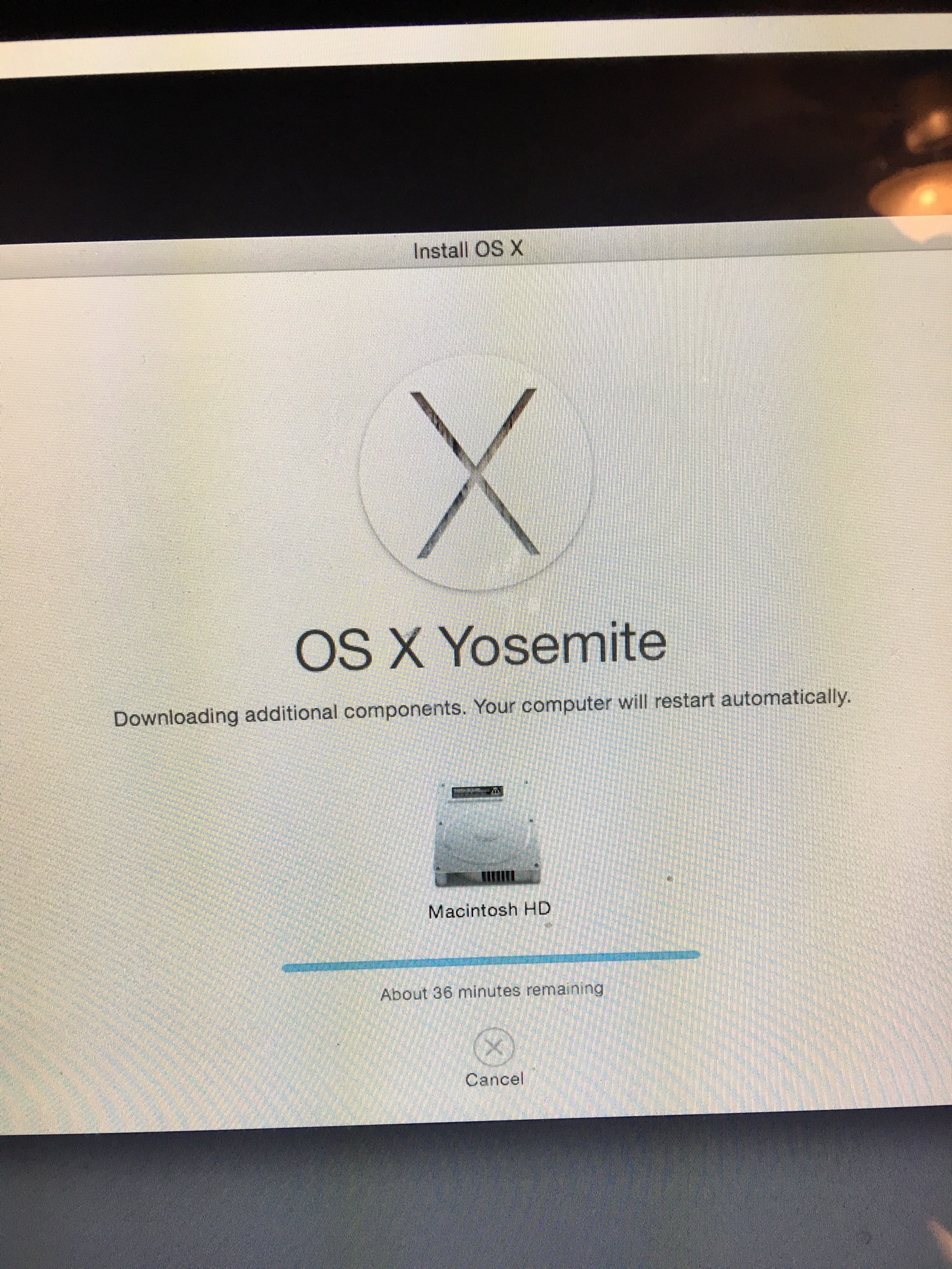 I have an iMac that froze up. I used disk utility and repaired and verified. Next, I went back to reinstall OS X and installed that. However, the screen is stuck at downloading additional components, computer will restart when finished. There is zero movement in the progress bar even if it is left on for hours. I do not have the original disk as this is refurbished. I dont know what else to do really. I got online here soley by clicking get help online. I did not have anything in Time machine.