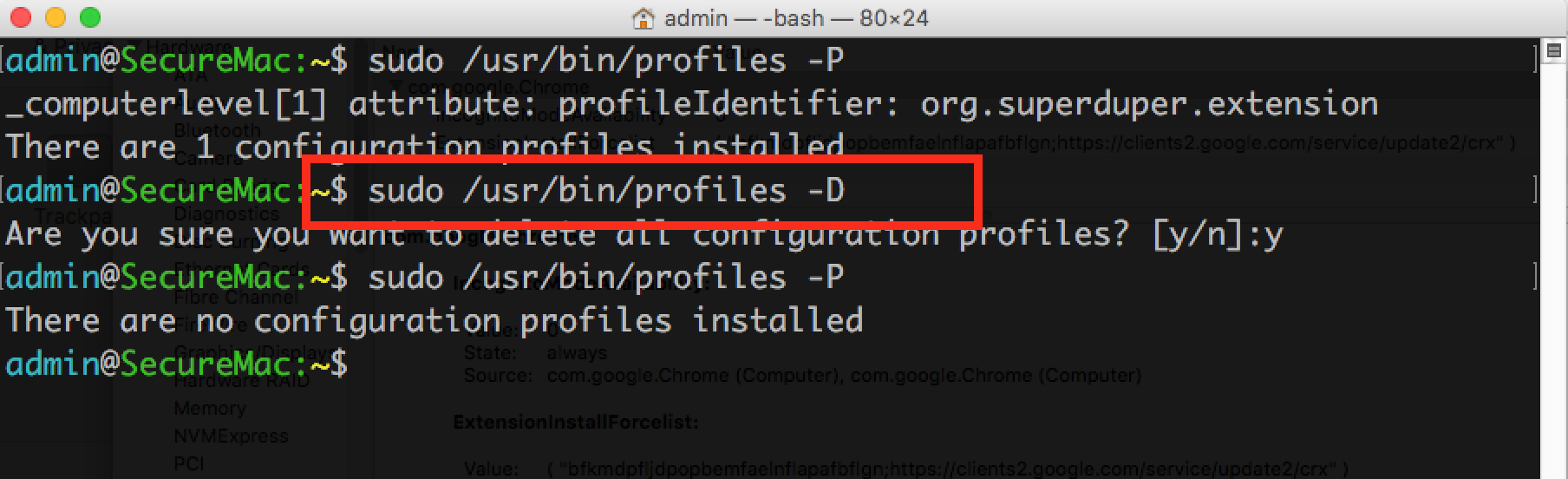 *If you or the machine's administrator are using 'Managed Preferences' then do NOT use the '-D' switch in step 3. You'll need to identify the correct profiles. Use the -P switch to list the installed profiles and only delete the one with 'org.superduper.extension' identifier. Likewise, do NOT use the Trash All... feature in DetectX. Instead, double-click the items in DetectX's window to open them in Finder and remove them manually that way.