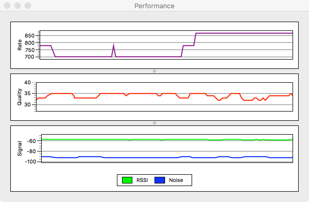 Ok, back to using Wireless Diagnostics. What we would be interested in is the SNR value over time. Specifically we would want it to not vary much. As you know, you can access this utility via Option-clicking on the Wi-Fi icon on the OS X menu bar. We would want to use the Performance tab. If there is significant amount of variation, the culprit can either be Wi-Fi interference or a faulty base station.