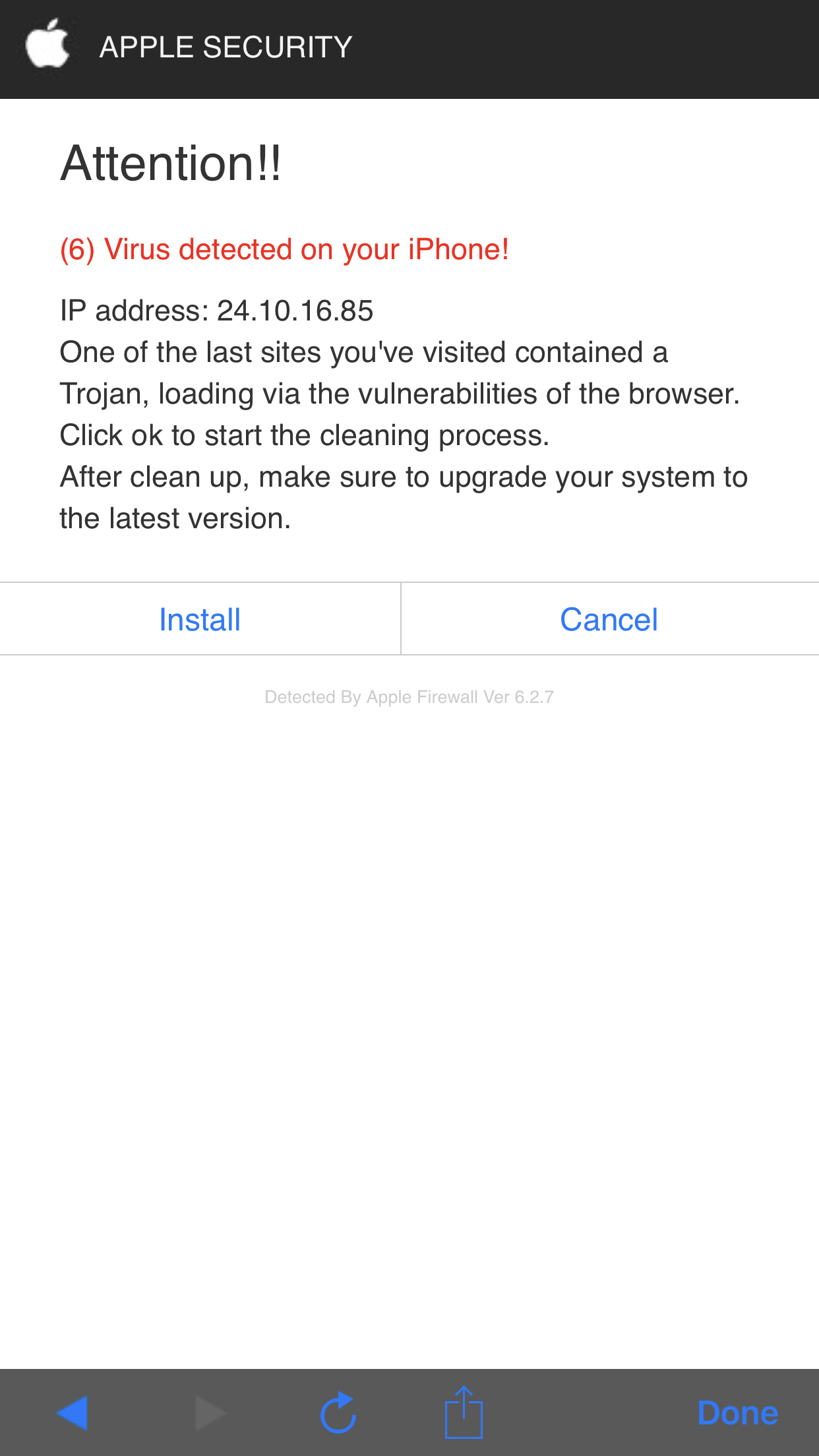 I received a pop up on my iPhone and it said apple security on the top but the web address on the page was pvsvw.net. It claimed I had recently gone on to a website with a Trojan virus and I needed to download a file on the page to update security on my phone. Not sure if it was geniuine instead of clicking on the install link I turned off the page went to settings and cleared the history on safari. I also searched the address on Google but came up with nothing. Has this happened to any one else?