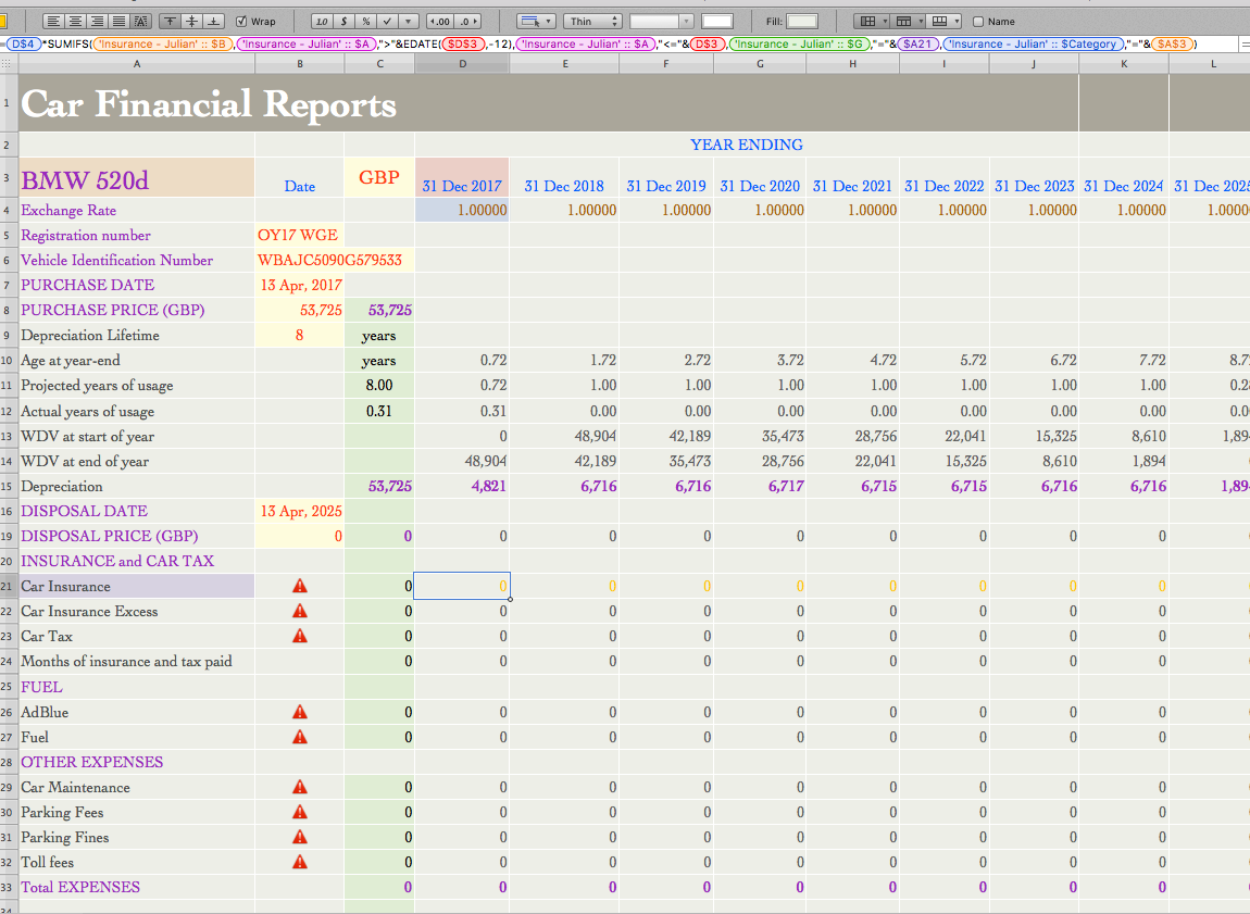 =D$4*SUMIFS('Insurance - Julian' :: $B,'Insurance - Julian' :: $A,">"&EDATE(D$3,-12),'Insurance - Julian' :: $A,"<="&D$3,'Insurance - Julian' :: $G,"="&$A21,'Insurance - Julian' :: $Category,"="&$A$3)