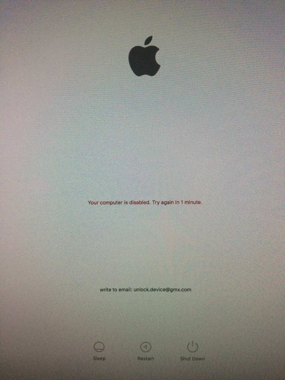 It never worked, so we tried to plug the internet cable to IMac hoping that it will as least show in online mode, but that didnt work out, in the end he suggested to erase my Imac from my icloud, from my devices hoping that it will free my device from everything ( like when you sell your device) but NOTHING changed the screen and that lock code with that email address. He was so surprised (senior manager) that he asked if we have some small kids or anyone else that could do/ type something by accident, since he could not believe that someone hacked my apple id and that they did not changed my password. And then I said that we dont have kids, and that even if i (or anyone from our family ) was sleepwalking, crazy or whatever how and why would anyone leave that email asking for 50$ worth bitcoins ????