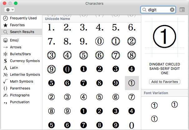 "Often, you will see Unicode characters represented as U+2460 ① . You can actually type this unicode string in the Character Viewer search window, and the corresponding character code will appear. In HTML, it would be represented as "①" without the quotes. You can see these values in the previously linked Enclosed Alphanumerics chart."