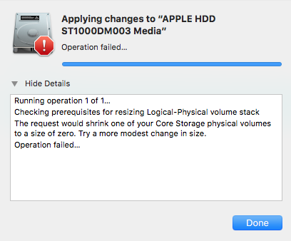 I wanted a clean reinstall of macOS Sierra and went to the Disk Utility while booting my iMac (Late 2012, i5, 1 TB Fusion Drive). From the DU I removed a partition I no longer need and the whole thing crashed (beach ball for 3 hours). I pressed the power button on the back and restarted. Now that I have macOS installed I wanted to create a new smaller partition. But I get always this error message: