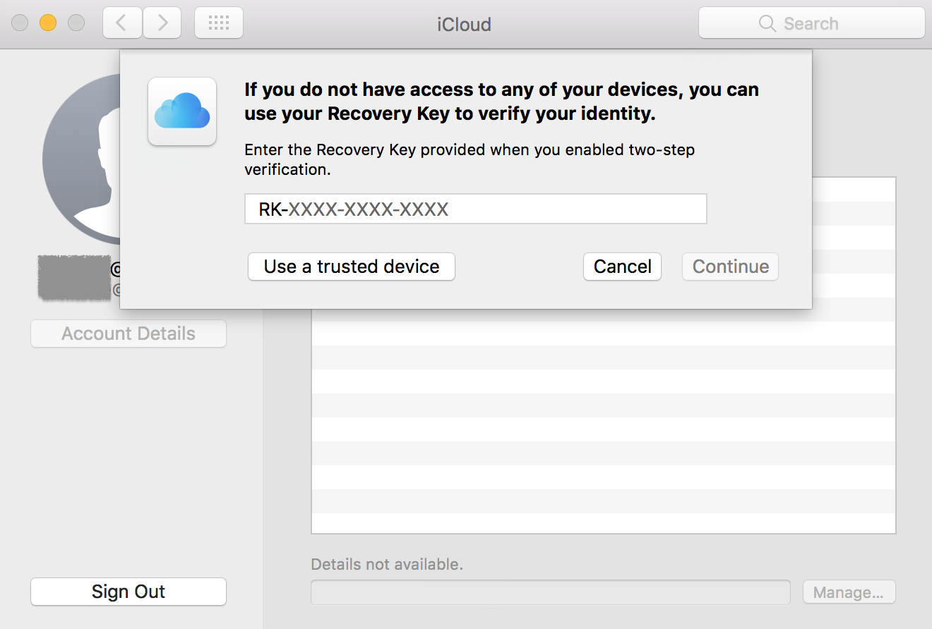 I am unable to log on to my icloud account. When I try to log on it's asking for my Recovery Key which I do not have. When I click to use a trusted device and select my ipad pro, the verification code is never sent. The other "trusted devices" listed are my old iphone 6 and a very old SMS number. When I log on to my Apple ID account, the trusted devices are my Mac book, iphone 7 and ipad pro.