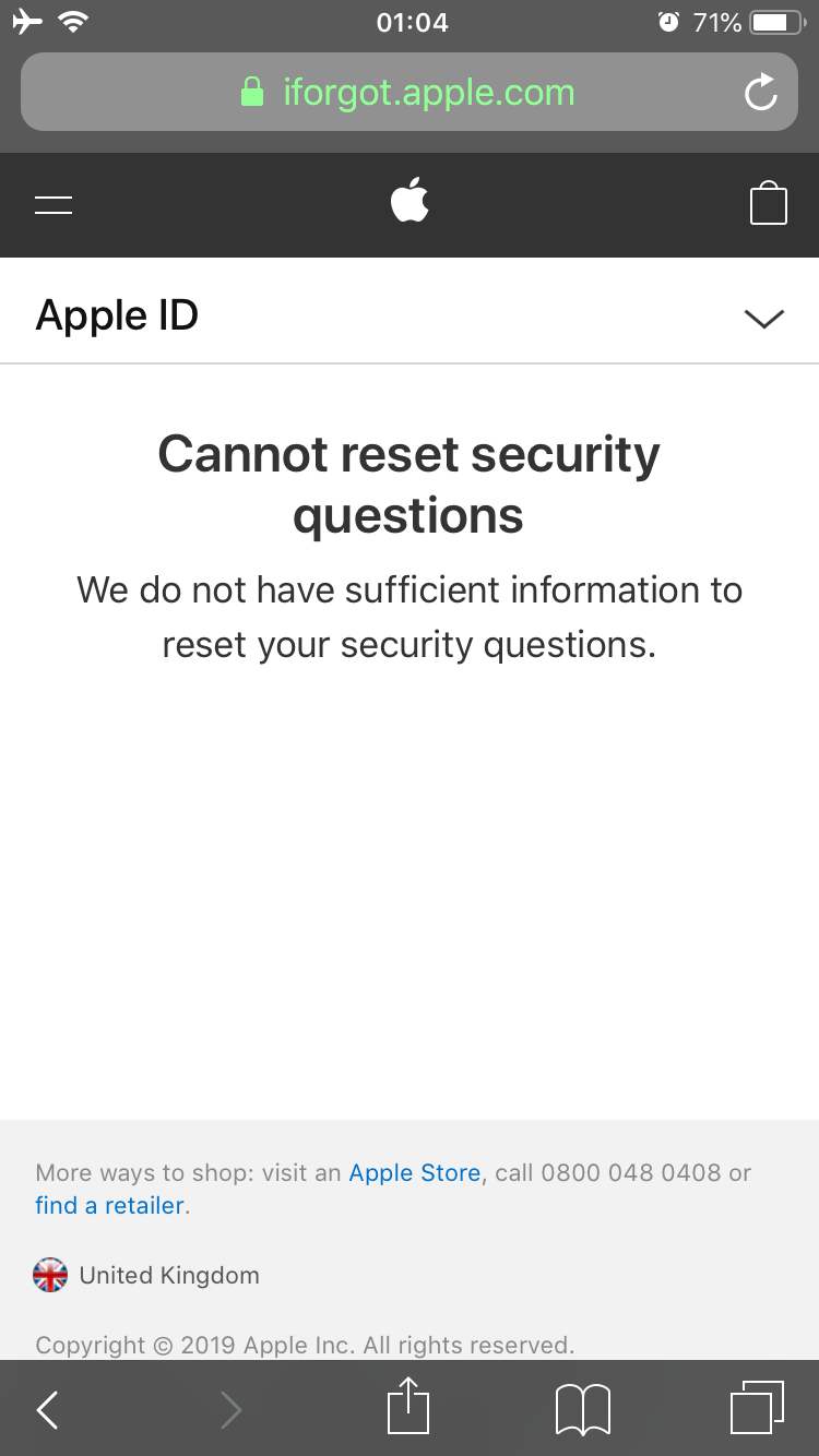 Apple ID Cannot Reset Security Questions We don't have sufficient information to reset your security questions. iPhone 7 Plus, iOS 10.3.3 I know my Apple ID and Password, but I forgot security questions answers, so I can't reset the security questio