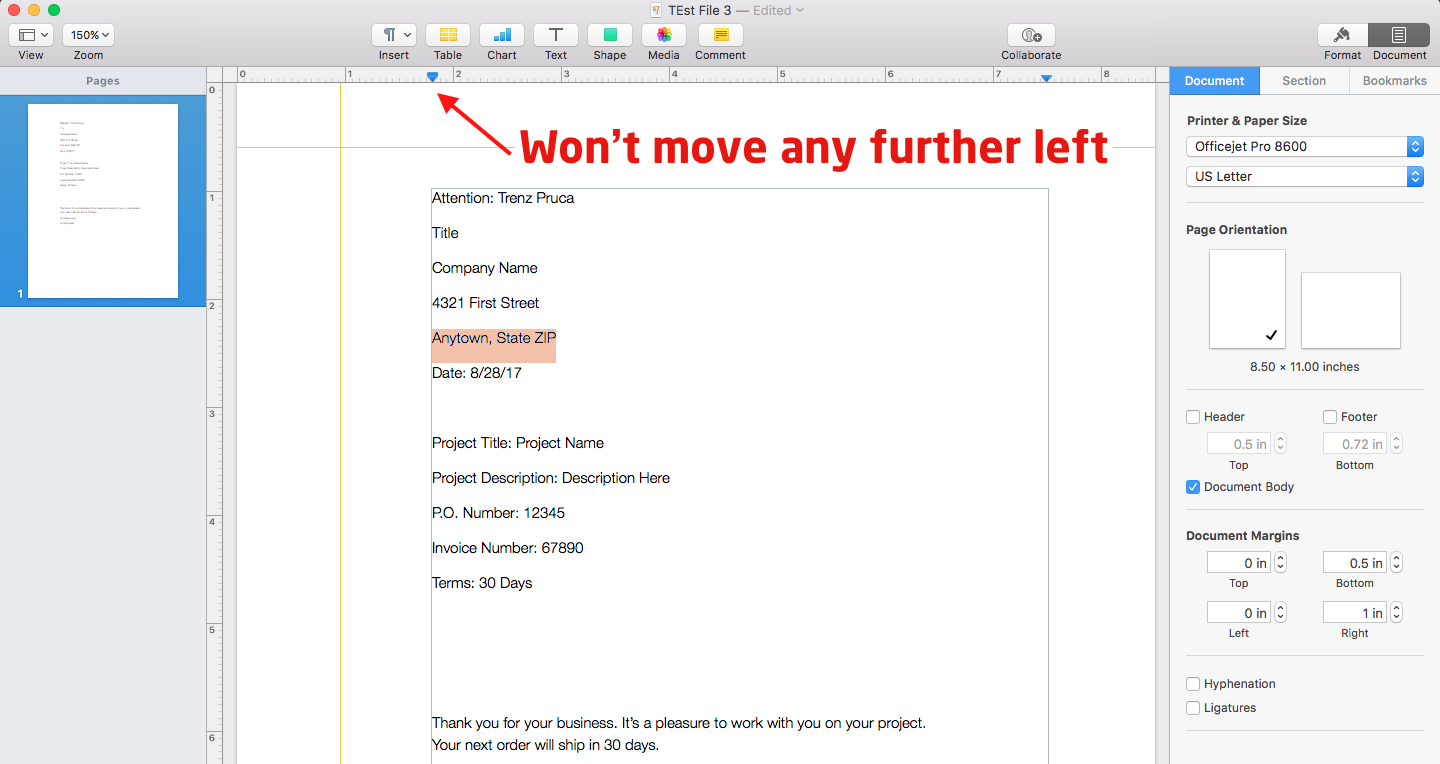 Using the "Invoice" Template in Pages I cannot Move the Blue Triangle Left of 1.75" in the Horizontal Ruler even though Document Margins, Left Indent, and all other settings are at 0.0".