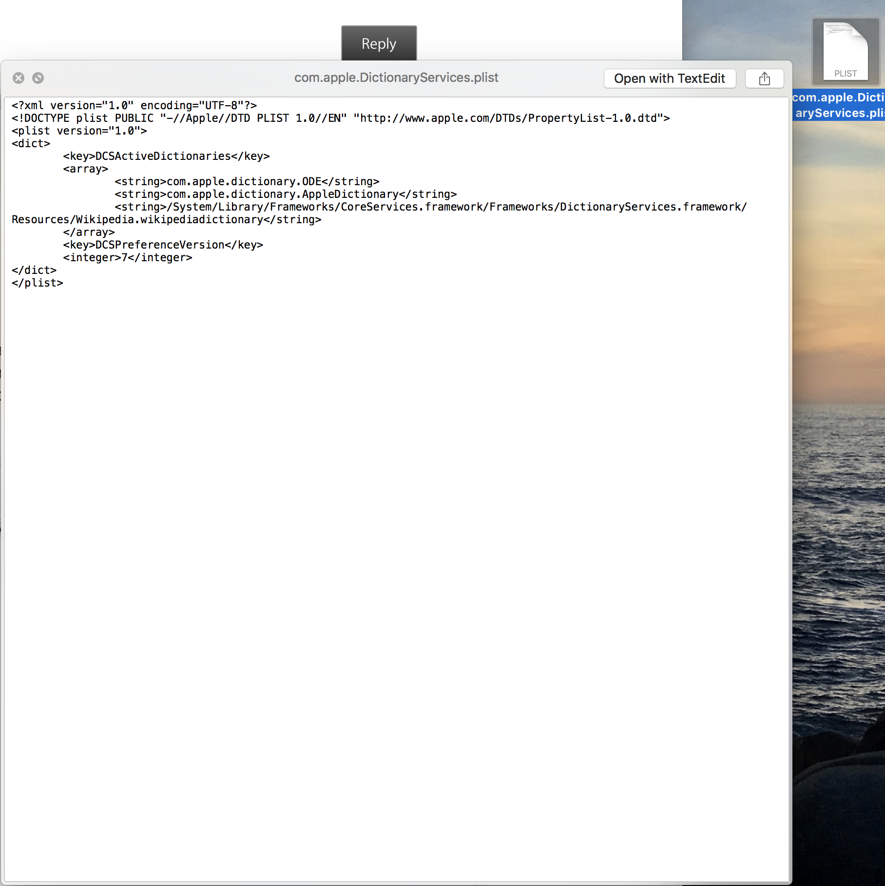 Note : For different Mac ( Like Mac Pro , Mac Book air ) the name of dictionary plist could slightly vary .