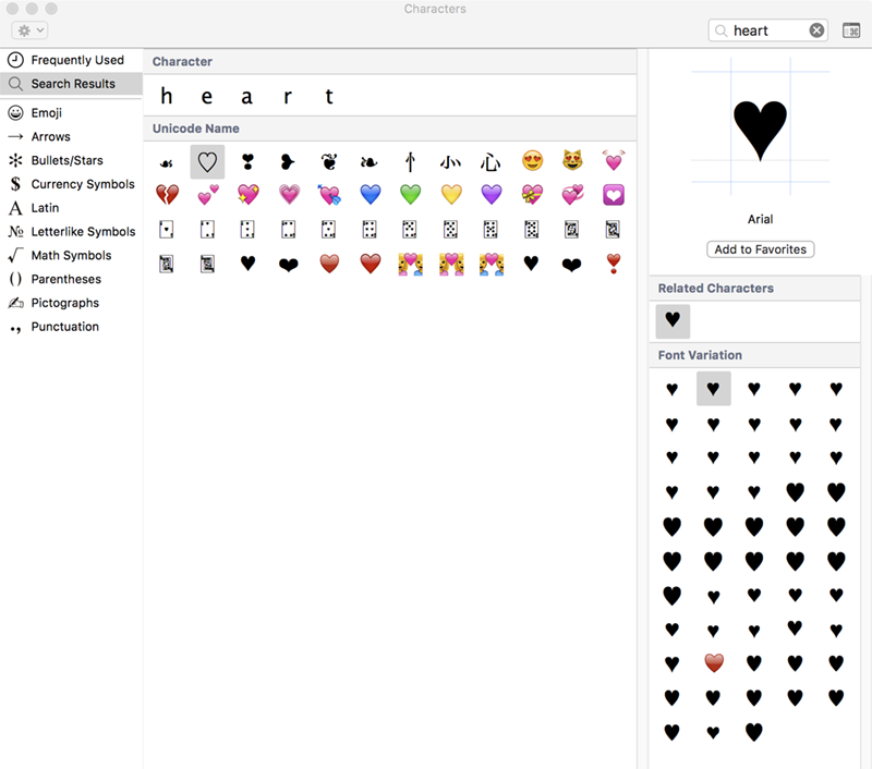Simplest for you is to do as Tom suggested and copy the suits from the Character Palette, which will again be the from whichever font you pick the shape from. Here, I have the heart glyph chosen in Arial. But there's a heart glyph in all kinds of fonts. As you click on each one, the palette will tell you which font the highlighted glyph is in.