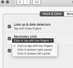 I have a new 2017 13" Macbook Pro that won't right click. I've set the preferences to do the double tap in the lower right corner, held the control key and tapped and tried a two finger tap as shown in the video. None of these adjustments result in a "right click".