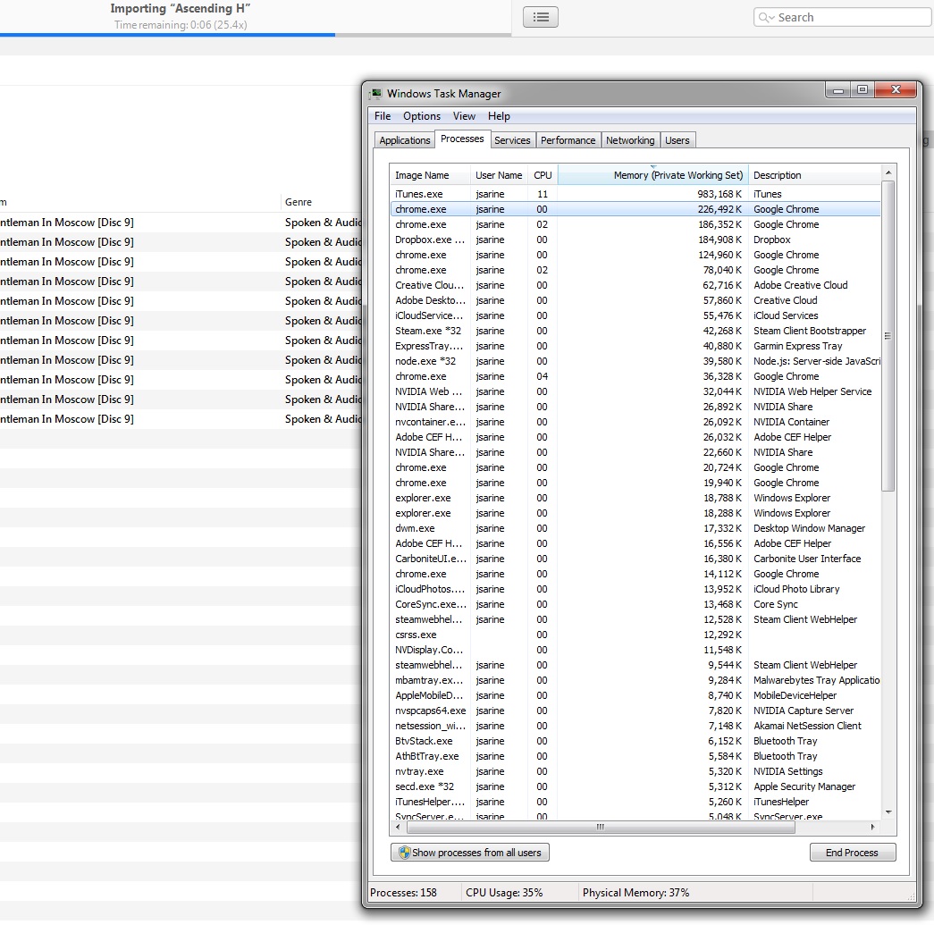 The first picture is right after it locked up. Notice there's 37% Physical Memory used. The second picture is 4 minutes later. iTunes is now using over 11GB of memory and pushed the Physical Memory used to 95%.