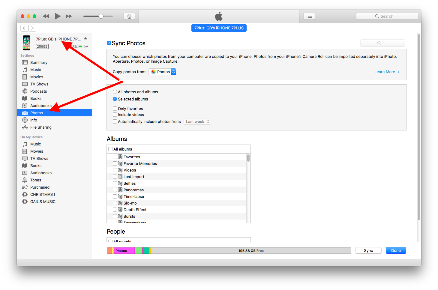 There is also a Devices list in the sidebar. However, you do need to click on the iPhone icon to change the sidebar to the normal list for syncing, which includes Photos:
