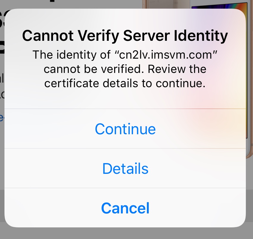 The identity of "cn2lv.imsvm.com" cannot be verified. Review the certificate details to continue.
