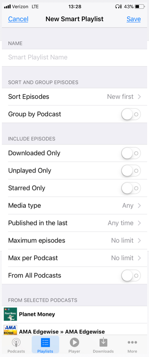 But sometimes, I like to listen by length. Because I have 10 minutes to kill and I don't want to have to search through and find one that's 10 minutes. So I have playlists which separate my podcasts by time. < 5 minutes, 5-10, 10-15, 15-20, 20-30, 30-45, 45-60, and > 60 minutes. Can stations do that? No.