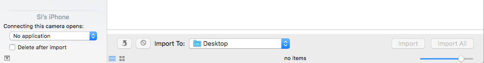 Also, bottom left is a small upward arrow, if clicked it shows what operations can be done once imported - you can tick "Delete after import", then click "Import All" to see if they get transferred to your Mac followed by being deleted from the device.