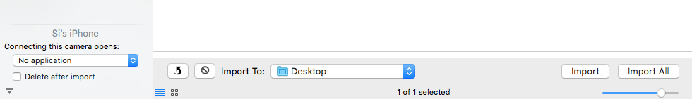 Also, bottom left is a small upward arrow, if clicked it shows what operations can be done once imported - you can tick "Delete after import", then click "Import All" to see if they get transferred to your Mac followed by being deleted from the device.