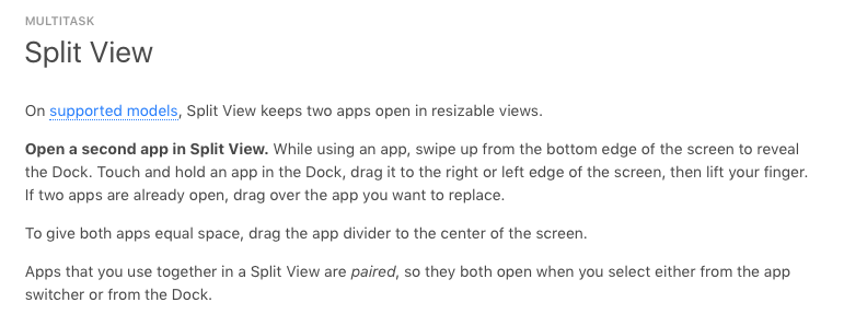Before iOS 11 you could open two apps at a time. Just swipe your finger from the right side to the left side and you could open a selected app. You could be in Safari and have your Fotos open on the right side.