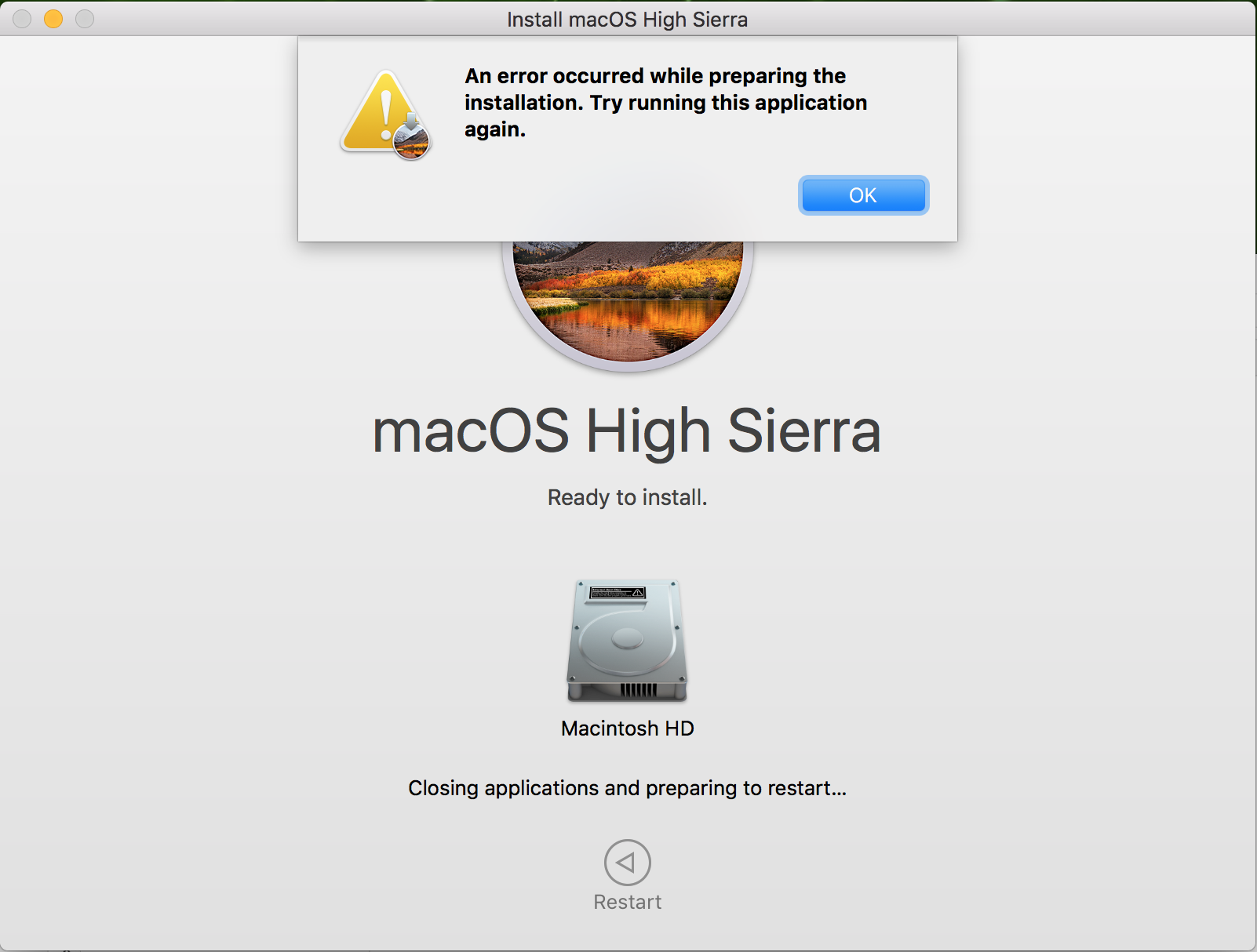 Unable to install High Sierra - "an error occurred while preparing the installation"