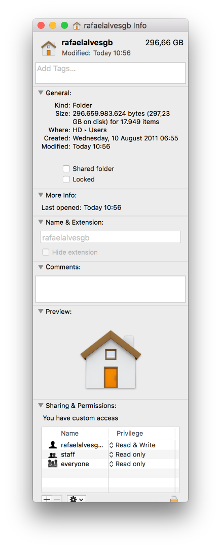 2) Actually, it appears that users folder's storage (function "Get Info") is higher than informed on Terminal: 296,66GB, instead of 273GB. It might be a Spotlight problem?