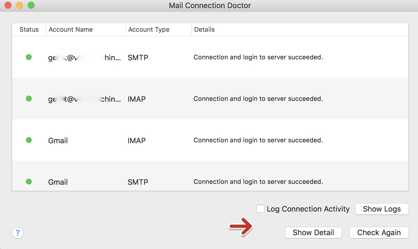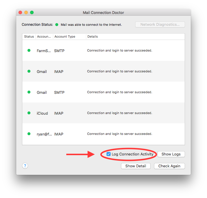 ~/Library/Containers/com.apple.mail/Data/Library/Logs/MailYou can disable this option form connection doctor in Mail.app.
