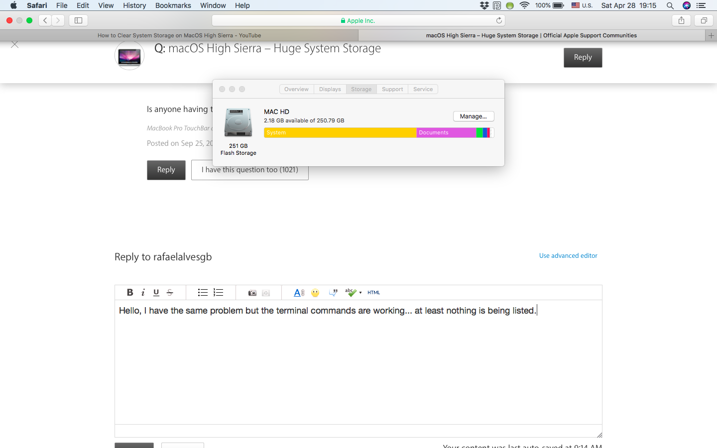 I tried everything I read here: deleted Time Machine snapshots, reindexing with Spotlight, but nothing worked. I tried installing a fresh copy of High Sierra over the original but couldn't because I didn't have enough disk space!! And I there was nothing I could do to create more, since ever app and file I deleted had it's HD space gobbled up by System!