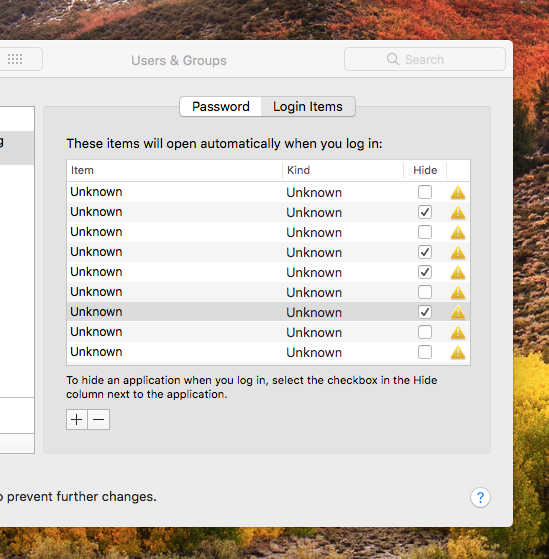 Deleting an item by clicking on the minus sign (after unlocking the padlock icon, of course!) doesn't delete it; the list box simply moves focus to the item above. Most mysteriously, clicking on the "Hide" checkbox causes another Unknown item to be created. After trying to resolve this a bunch of times I now have something like 40-50 Unknown entries in "Login Items".