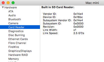 Alas, the PRAM reset didn't rectify the problem. After resetting the PRAM and booting up again, the mid-2010 Mac mini's system report did register that a built-in SD reader is present, which seemed promising, but the reader still wouldn't read cards. (I've tried several brands of SD cards, all of which worked prior to updating to High Sierra and still work when inserted in my printer's memory card reader or if I use a USB card reader. Only the Mac mini's internal card reader is compromised. After resetting the PRAM and getting the computer to at least register that an internal memory card reader is actually present. I tried several troubleshooting suggestions in previous posts (e.g. Command+R, launching Image Capture and then trying the card, and checking to see if Disk Utility registered the card it didn't). If it was a Finder issue, as some have suggested, I figured it wouldn't hurt to trash the Finder.plist file and reboot. After doing this, the computer's system report reverted back to its, "This computer doesn't contain any Apple memory card readers" status. So, basically the PRAM reset got the computer to temporarily register that a card reader is present, but I'm still at a loss as to how to get it to actually detect/read cards again. Hopefully 10.13.4 will address this, especially considering how many people with certain Mac models are experiencing similar woes.