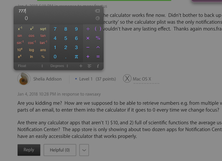 As you can see, you can see through to what is underneath because of the "overlay" setting, and you can drag the widget anywhere on the screen. Pressing F5 (or whatever key combo you chose) or ESC makes Dashboard disappear. The great thing is, the calculator retains the total no matter what you do. At least it has worked for me for the last couple of years. It does have scientific functions, but your main functions are easy to get to. Hope this helps you and others looking for an alternative.