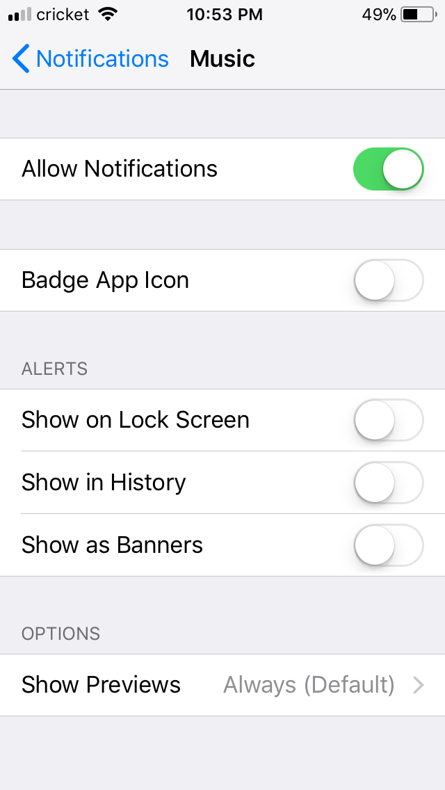 Go to Settings, then Notifications. Scroll down to find Music, tap once and make the settings look like this: