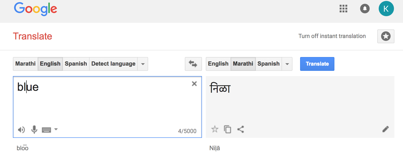 - Type n i shift+l a ( I entered the word which means 'blue' in Marathi. )