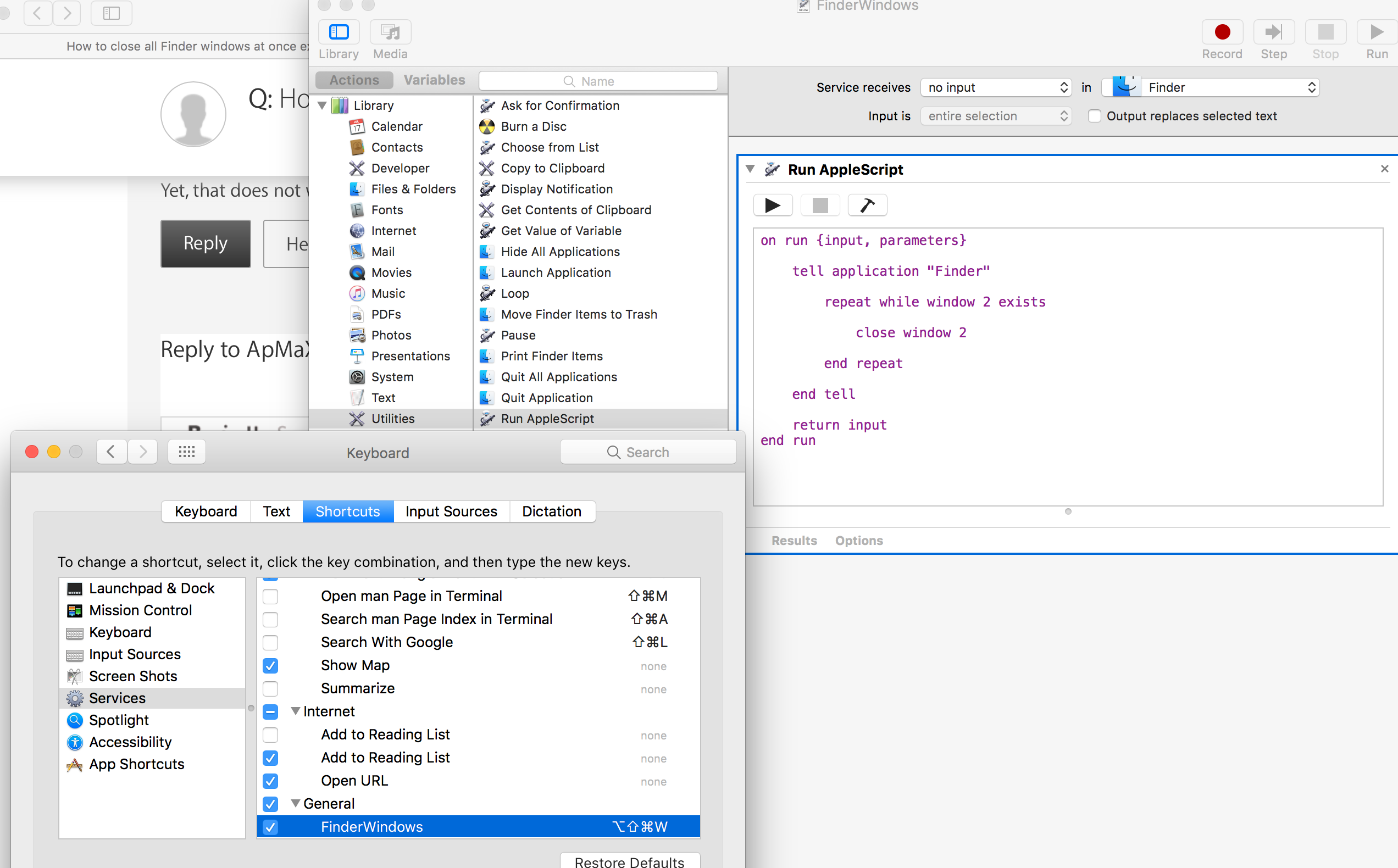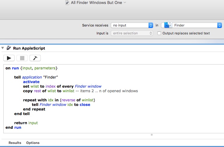 And in System Preferences : Keyboard : Shortcuts : Services : General, I assigned a keyboard shortcut of control+command+W, which allows one to invoke the Finder Window closing code from the keyboard, or one can choose Finder menu : Services : All Finder WIndows But One.