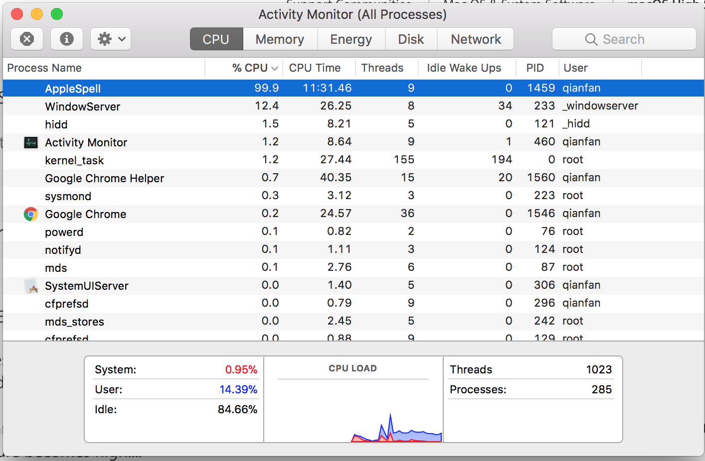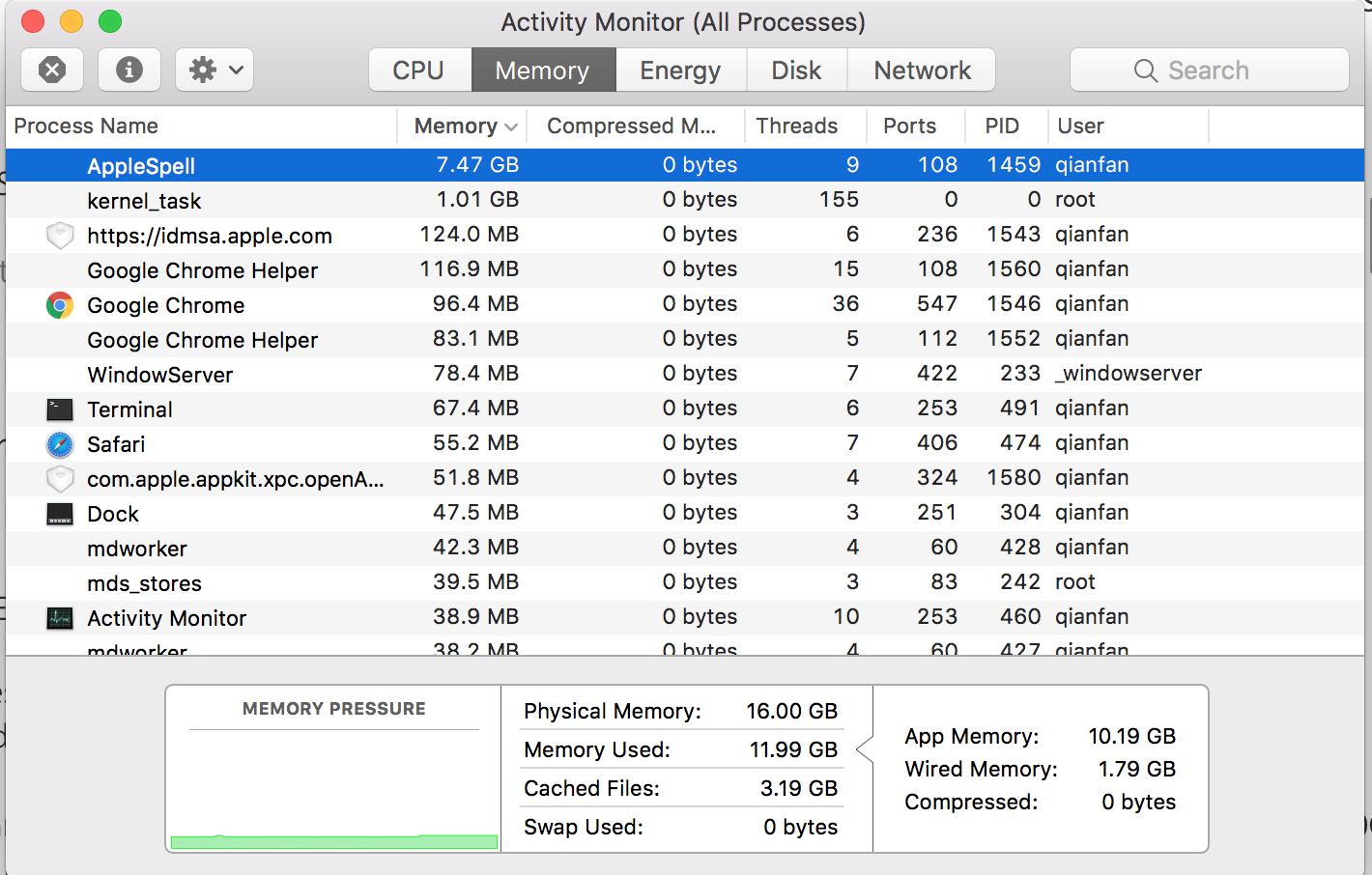 2> AppleSpell kept running at 100% CPU (even through total CPU usage is not high). This process also reaches 30, 40, 60GB memory. Memory pressure becomes high....