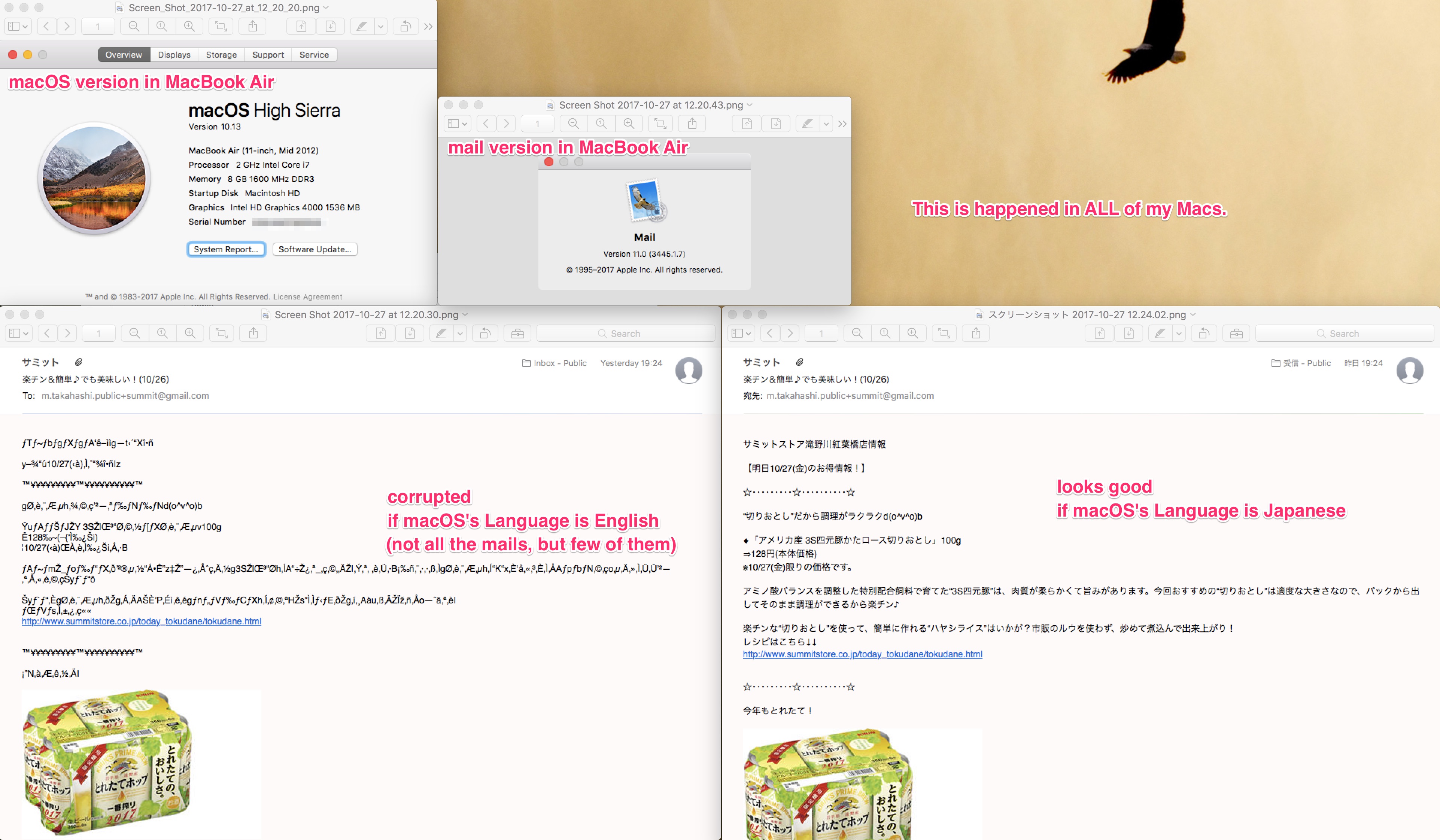 After updating to 10.12.4 from 10.12.3, (now 10.13) character corruption of some of the received and new coming emails occurred in Mail.app.