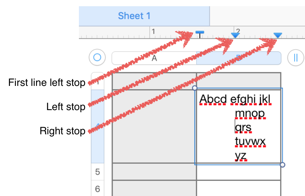 Click twice on one of the affected cells to place the insertion point in the cell. You should then see something similar to the three blue markers in the ruler above.