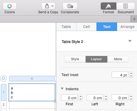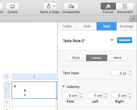 How do I get rid of hanging indents in a table cell in Pages?