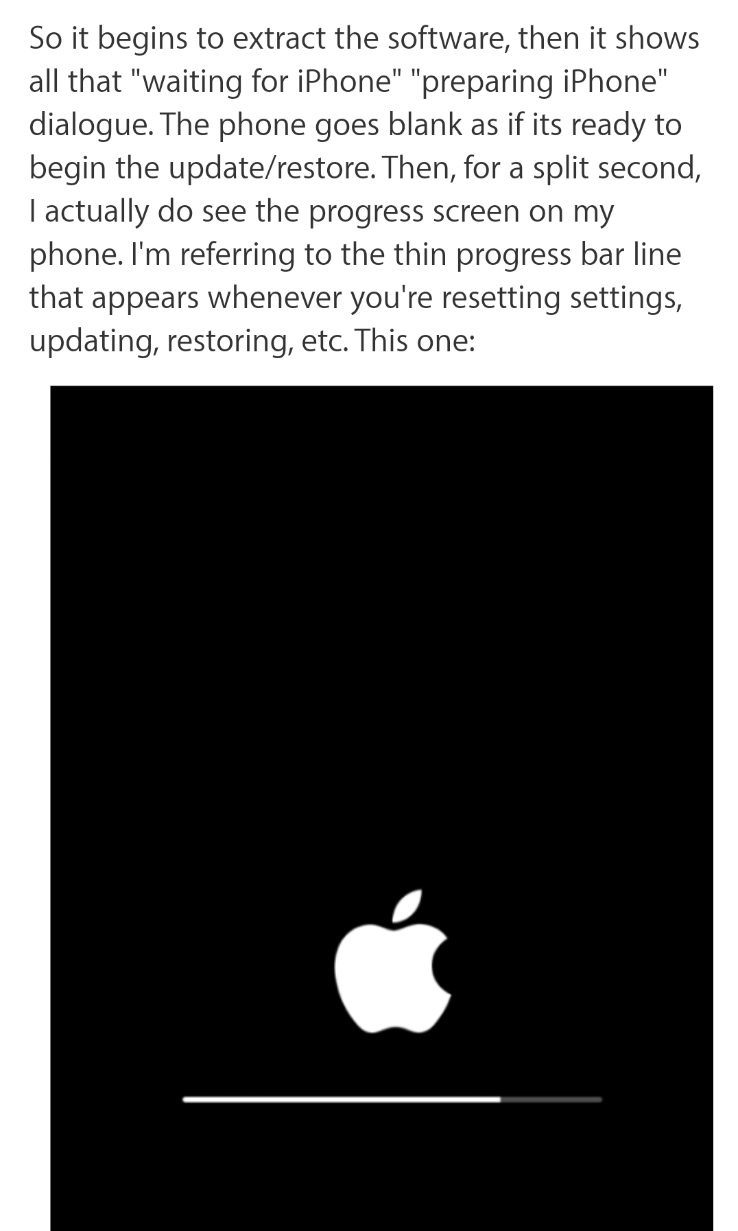 So it begins to extract the software, then it shows all that "waiting for iPhone" "preparing iPhone" dialogue. The phone goes blank as if its ready to begin the update/restore. Then, for a split second, I actually do see the progress screen on my phone. I'm referring to the thin progress bar line that appears whenever you're resetting settings, updating, restoring, etc. This one:
