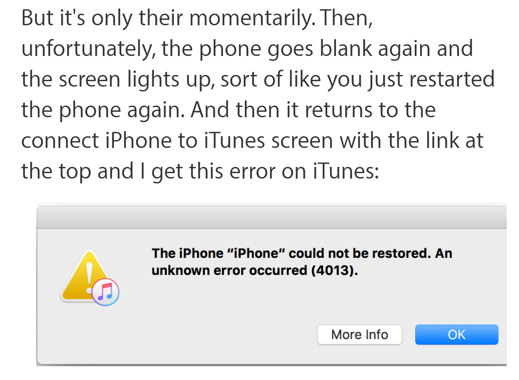 But it's only their momentarily. Then, unfortunately, the phone goes blank again and the screen lights up, sort of like you just restarted the phone again. And then it returns to the connect iPhone to iTunes screen with the link at the top and I get this error on iTunes:. I really don't know what to do. I've made sure my iTunes is up to date, I've restarted my mac, etc. I'm pretty sure my one year limited warranty is expired too and I really need this to be fixed. Does anyone please know a way to do this so that I don't have to bring it in? I am a college student and I am doing research at the moment. I need my phone and do not have any time whatsoever to go to an apple store.