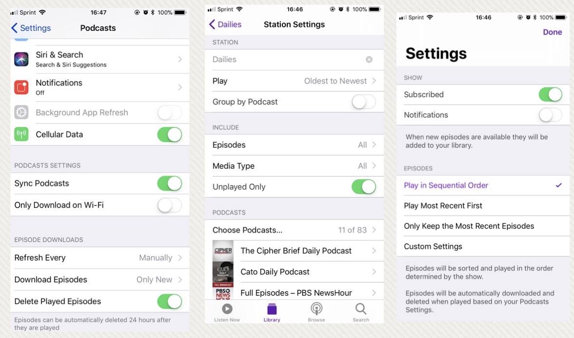 Below are my settings preferences for the Podcasts App (left), Stations (center) and Shows (right), which might be a handy starting point, if you have questions or problems.