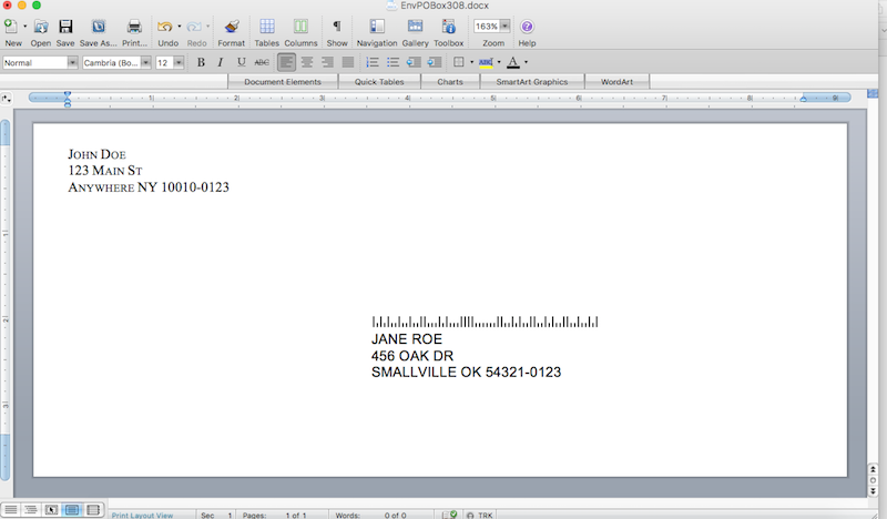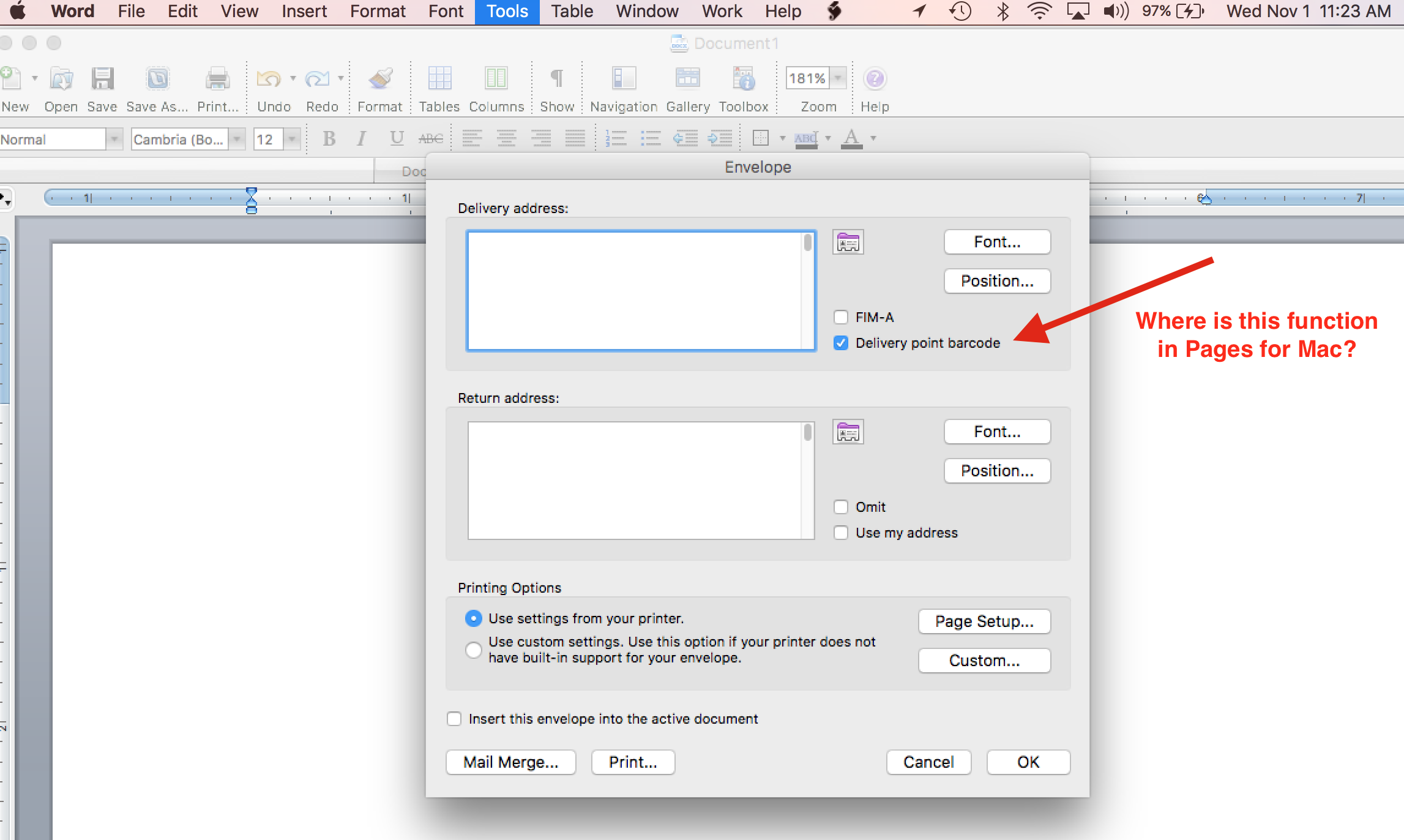 The US Postal Service (a/k/a "USPS") uses bar codes for scanning and sorting mail. A bar code pre-printed on the envelope makes delivery faster and more accurate. Word has incorporated this feature for many years; the image of an envelope ready to be printed (below) is Word 2008! When I read that the upcoming OS High Sierra will likely be incompatible with existing Word files, I started looking harder at Pages to carry the full word processing burden, including dedicated envelope printing functions.