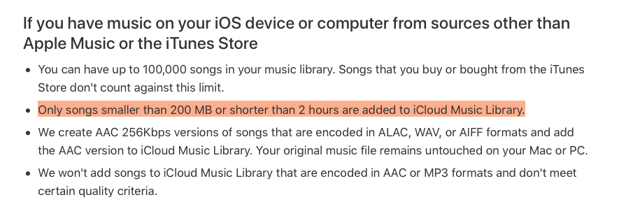 My friend creates really good music mixes, some of which are up to three and a half hours long. I assume there is a limit to the song time that can be uploaded onto iCloud music library because I am getting the 'ineligible for iCloud music library' notification?