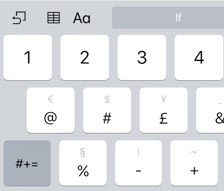 I have an odd problem on my iPad running iOS 11.1.1. When using the onscreen keyboard if I press the "123" button, the keyboard changes to numbers on the top row, then various symbols on the next 2 rows (@#£&* etc...). All good so far. If I then click on the "#+=" button to see more symbols (I'm actually after the plus symbol), the top row remains unchanged (ie showing the numbers and backspace), and the other rows change to what they should show. On my iPhone (running the same version of iOS) when at this point the top row shows other symbols ([]{}#%^*+=).